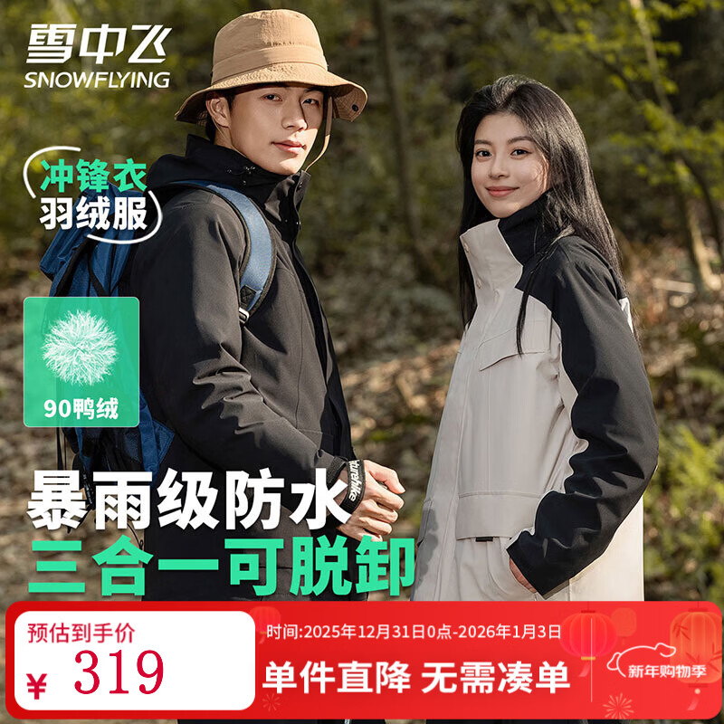 旗舰店雪中飞三合一机能冲锋衣款羽绒服情侣款冬季轻户外连帽拼接保暖羽绒外套 几何黑(5915F) L (175)