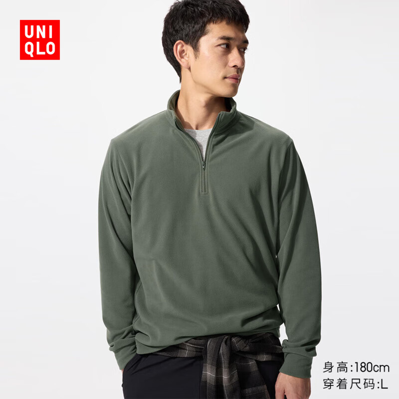优衣库男装柔滑弹力摇粒绒半拉链套头衫/长袖481184 54 绿色 M /170/92A