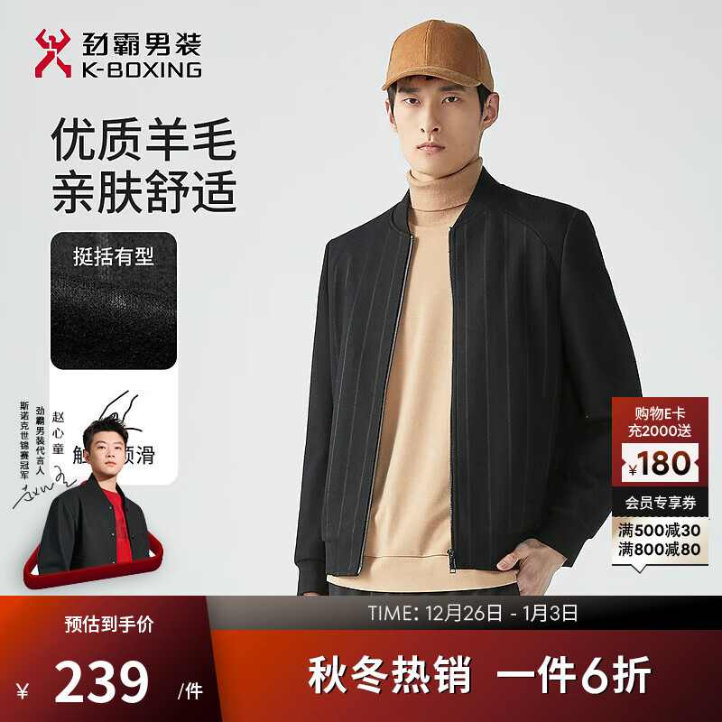 旗舰店劲霸男装【绵羊毛】外套男条纹棒球领休闲春秋薄毛呢夹克男|FBWG3319 黑色 M