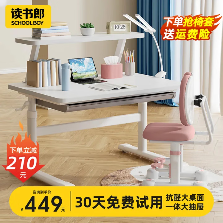 旗舰店读书郎儿童学习书桌椅套装多功能可升降中小学生桌椅子写字课桌久坐舒服 简约环保桌+书架+9cm追背椅粉
