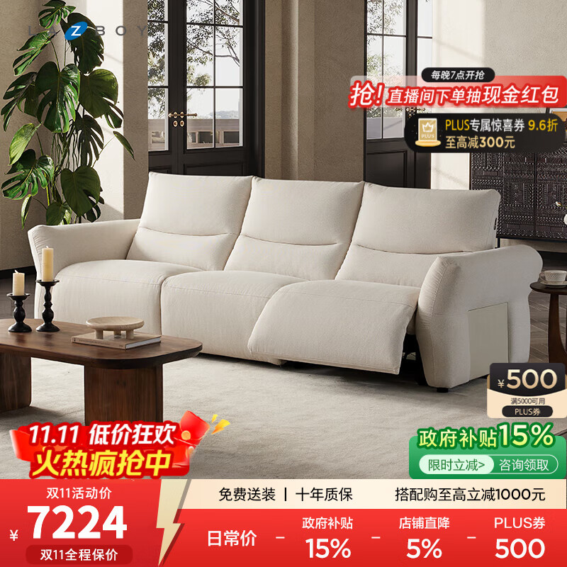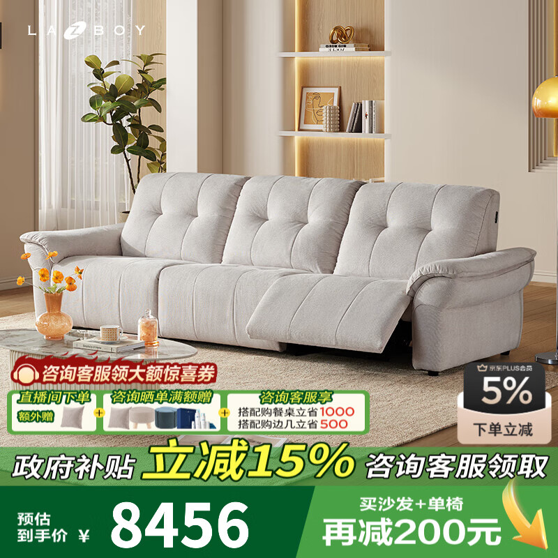 旗舰店乐至宝LAZBOY客厅沙发2025新款奶油风布艺电动0靠墙功能沙发花谷漫步679 云岚白-大-三人位双电动-2.95米-30天