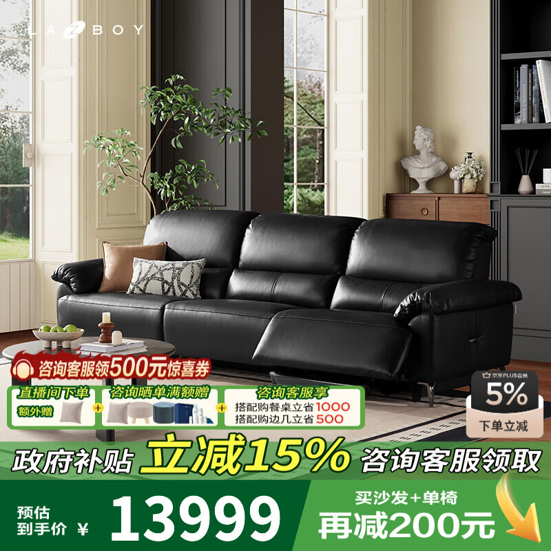 旗舰店乐至宝LAZBOY25年新款真皮功能沙发0靠墙仿油蜡双色细纹纳帕皮欢乐谷692 极夜黑-2.77m-三人位双电动-7天