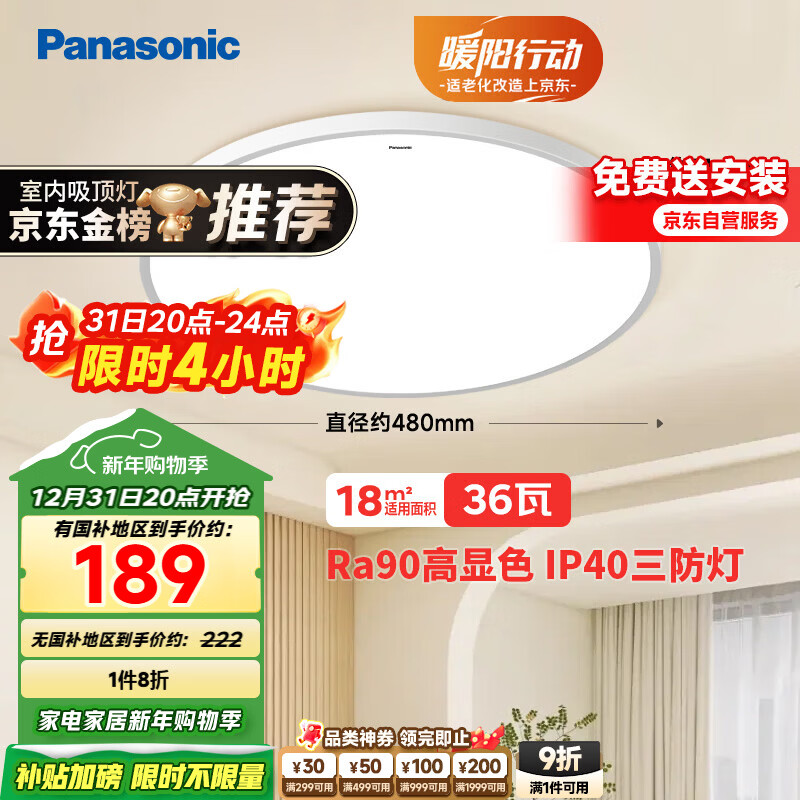自营松下(Panasonic)吸顶灯IP40三防 36瓦 RA90高显色 卧室阳台书房灯