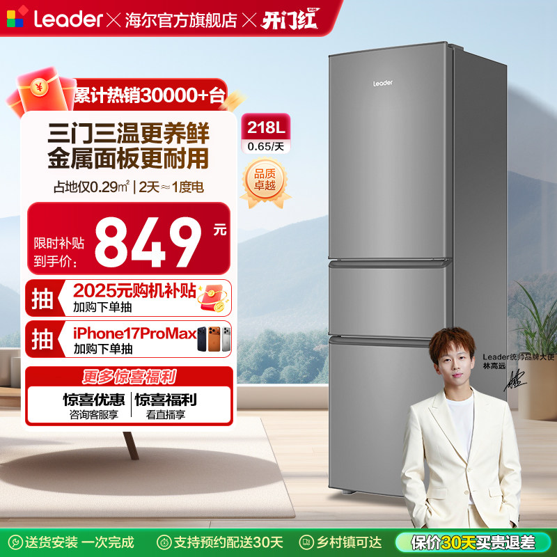 旗舰店政府补贴海尔出品统帅218L三门节能租房宿舍家用超薄小冰箱官方