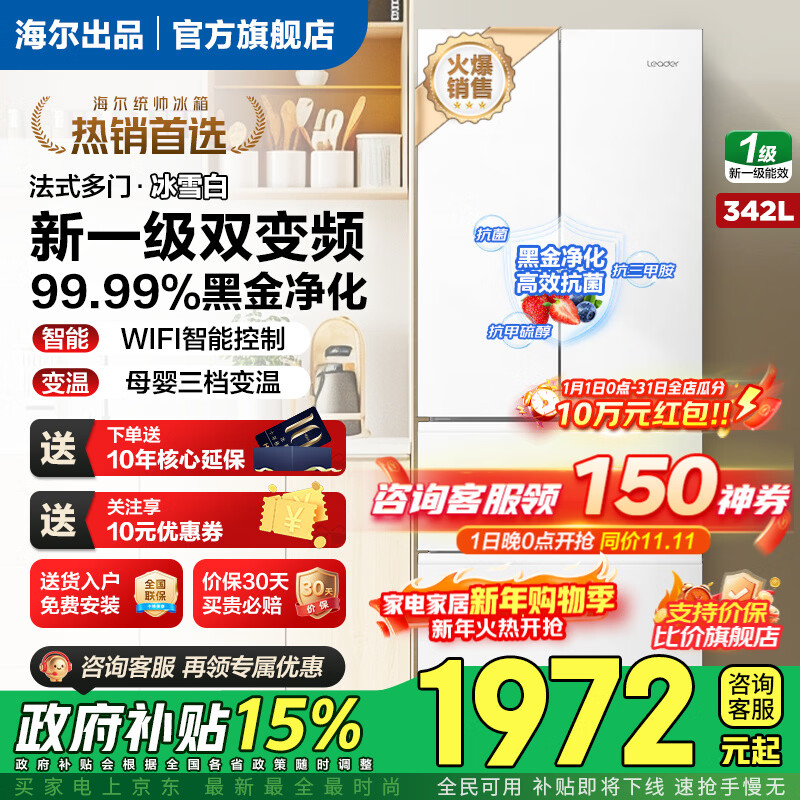旗舰店海尔(Haier)冰箱342升双开门法式多门冰雪白新一级双变频三档变温黑金净化节能省电统帅leader小冰箱国家补贴 342升冰雪白+新一级能效+三档变温+黑金净化