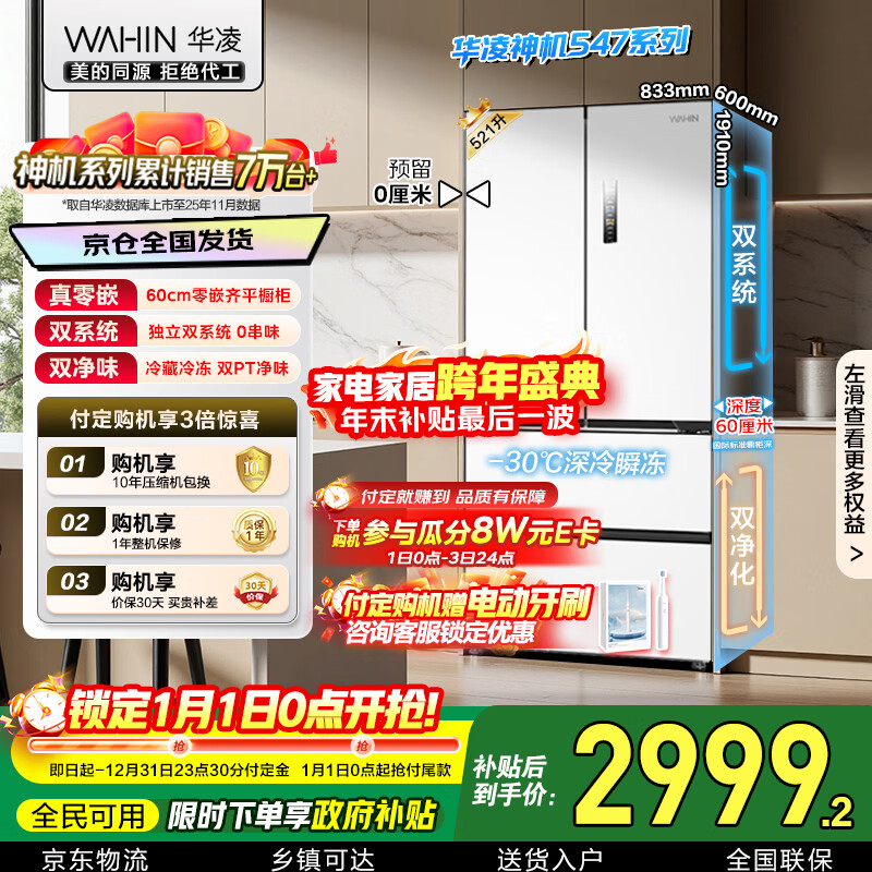 自营华凌美的出品神机521L法式多门60cm超薄零嵌冰箱双系统一级能效双变频风冷无霜HR-547WUFPZ国家补贴