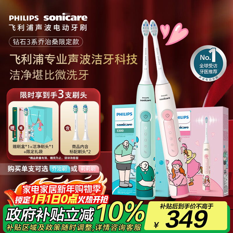 自营飞利浦(PHILIPS)声波电动牙刷钻石3系乔治桑限定礼盒 生日/新年礼物 情侣款送男生/女友 HX5171/01乔治款 国家补贴