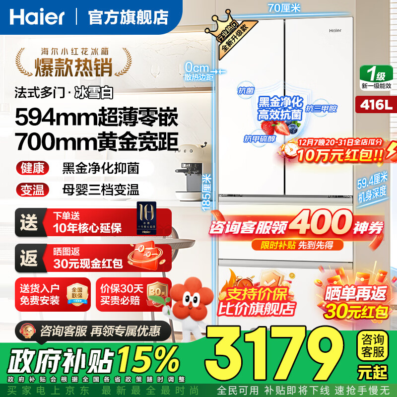 旗舰店海尔(Haier)冰箱「小红花2.0系列」416升法式多门四门594mm超薄零嵌入式一级双变频风冷无霜净味变温家用冰箱 416升冰雪白+594超薄零嵌+700超窄机身