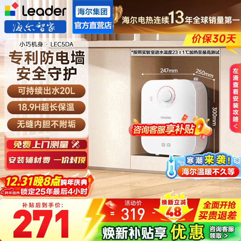 旗舰店海尔(Haier)【咨询客服享补贴】智家出品Leader统帅5升电热水器小厨宝DA/TP家用厨房速热长效保温储水式小尺寸 5L 1750W DA厨宝【性价比首选80%客户选择】