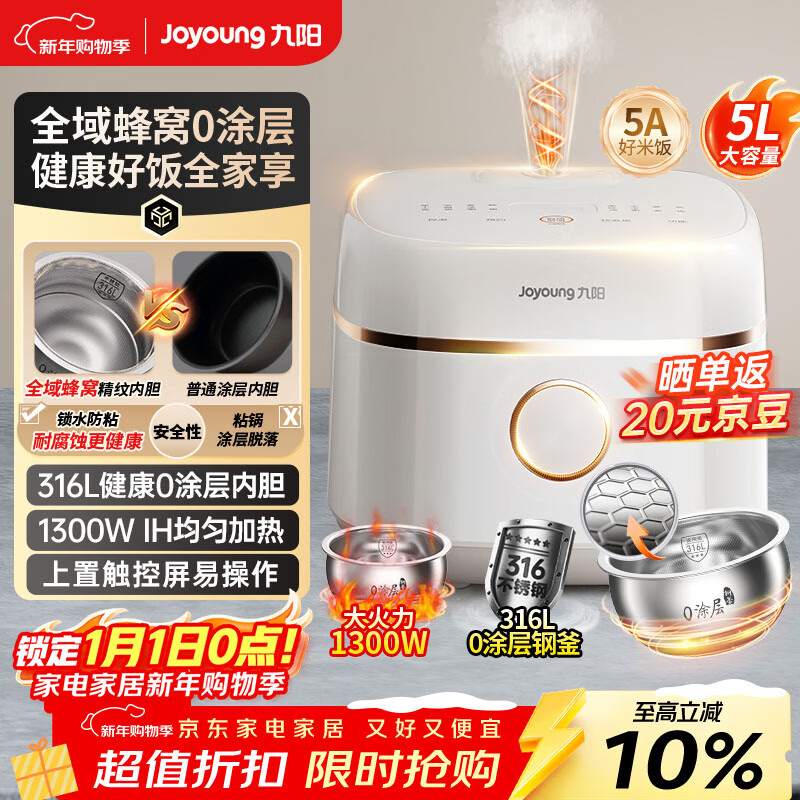 自营九阳(Joyoung)全域蜂窝0涂层316L不锈钢5升大容量4-6人IH加热5A级好米饭多功能不粘锅家用电饭锅50F560L国家补贴