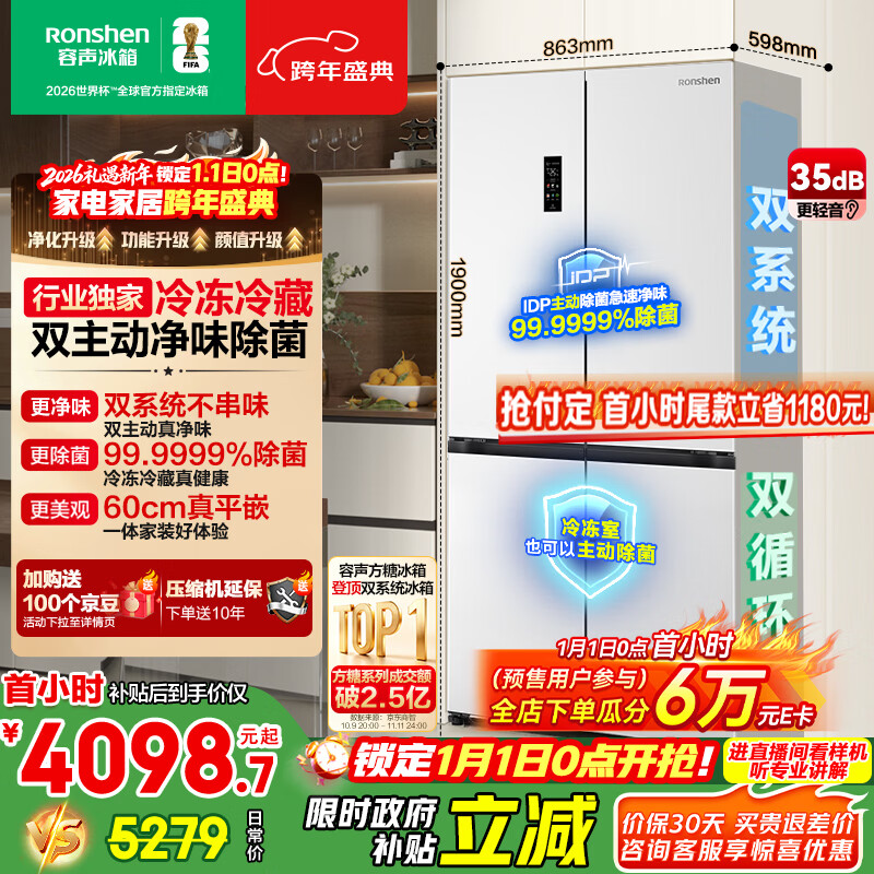 自营容声方糖505L十字门冰箱双系统双循环超薄零嵌入式主动除菌一级能效白BCD-505P60CZMAD国家补贴世界杯