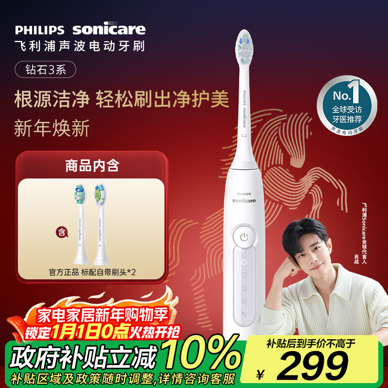 自营飞利浦(PHILIPS)【肖战推荐】声波电动牙刷钻石3系 新年礼物 情侣送男生/女友 微泡水流HX5181/01皓月白 国家补贴