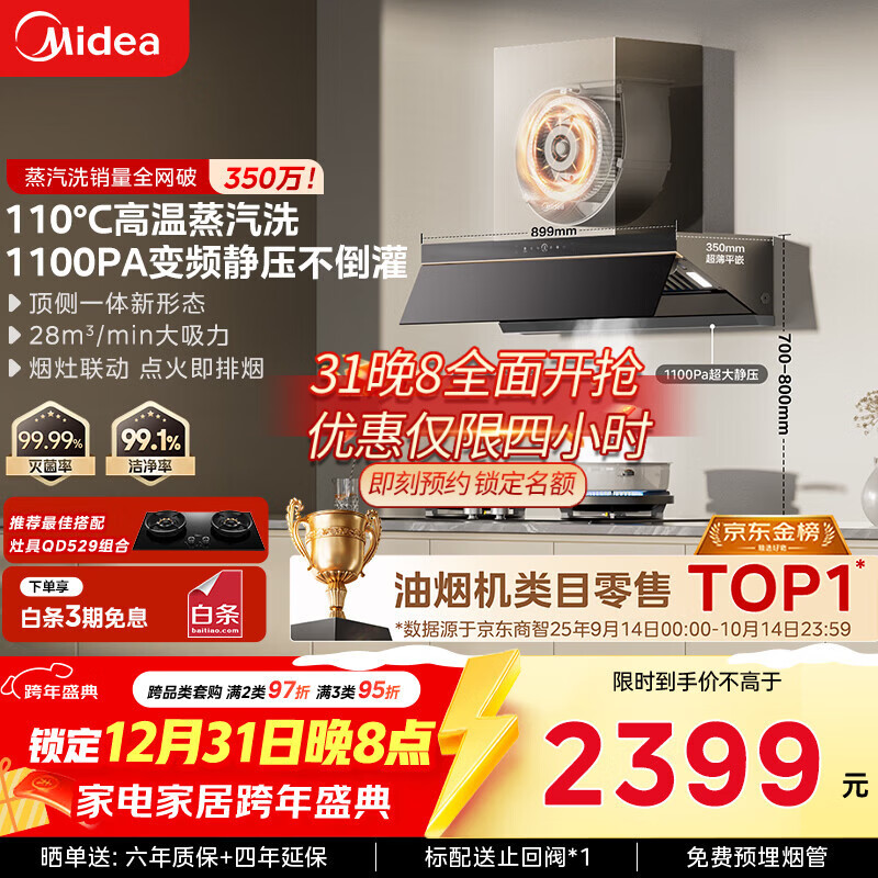 自营美的(Midea)【蒸汽洗AK7PRO】抽吸排油烟机家用28风量大吸力 顶侧一体 自清洁高温蒸汽洗吸脱排烟机