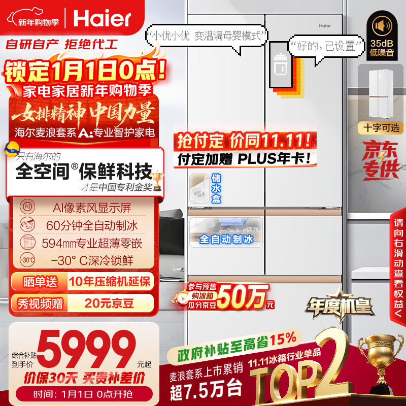自营海尔(Haier)「麦浪」511L法式多门母婴冰箱全空间保鲜超薄零嵌一级能效大容量白色BCD-511WGHFD1BWLU1国家补贴