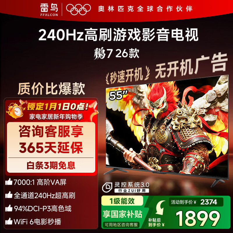 自营FFALCON雷鸟电视鹏7 26款 55英寸 高阶VA全通道240Hz高刷 HDMI2.1 94%P3色域 灵控系统电视机 55S78A