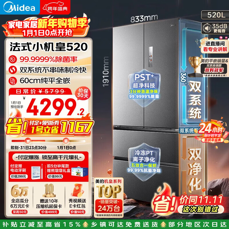 自营美的(Midea)M60小机皇520升法式多门冰箱零嵌双系统除菌大容量一级能效BCD-520WUFPZM(E)国家补贴