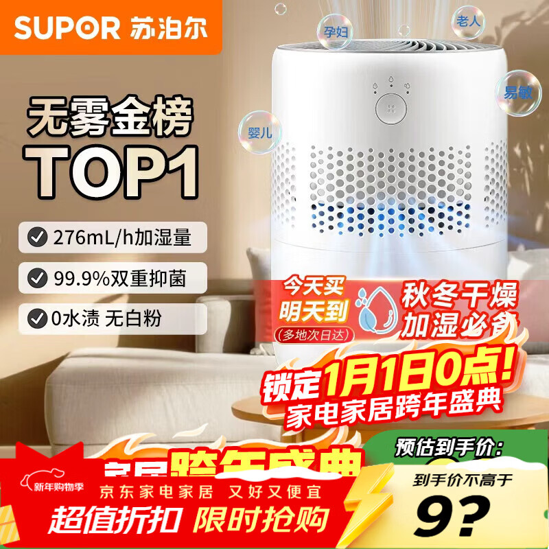 自营苏泊尔(SUPOR)加湿器无雾金榜轻音桌面大容量大雾量办公室卧室家用无雾加湿器空调风扇伴侣礼品EHTN-33A国家补贴