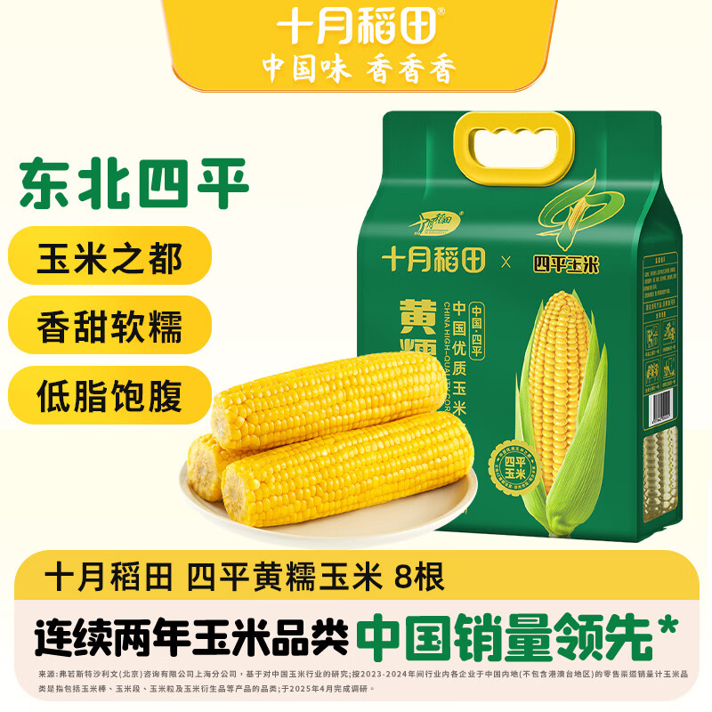 自营十月稻田 四平黄甜糯玉米 8根 3.52斤 东北黏玉米棒 真空包装 非转基因