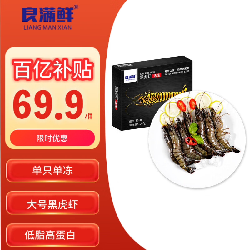 自营良满鲜福建漳州活冻大号黑虎虾 无冰净重2斤30-40只/盒海鲜大虾家庭聚餐