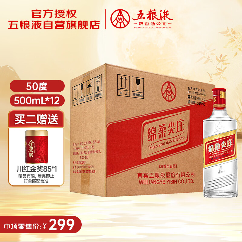自营五粮液股份绵柔尖庄131浓香型白酒50度500mL*12瓶 原箱装光瓶