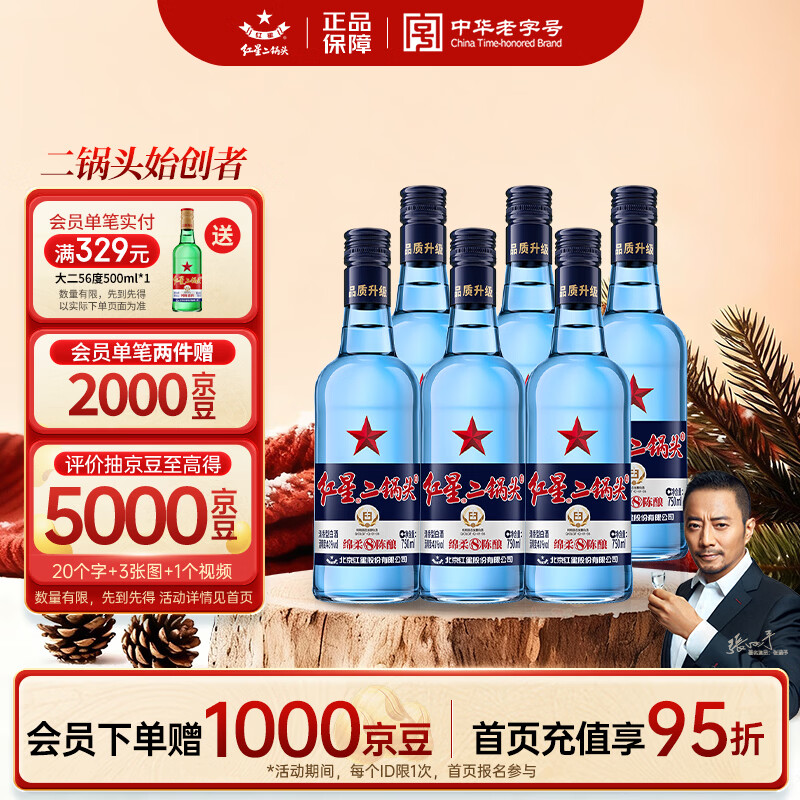 红星二锅头蓝瓶绵柔8纯粮43度750ml*6瓶整箱清香型白酒纯粮口粮酒
