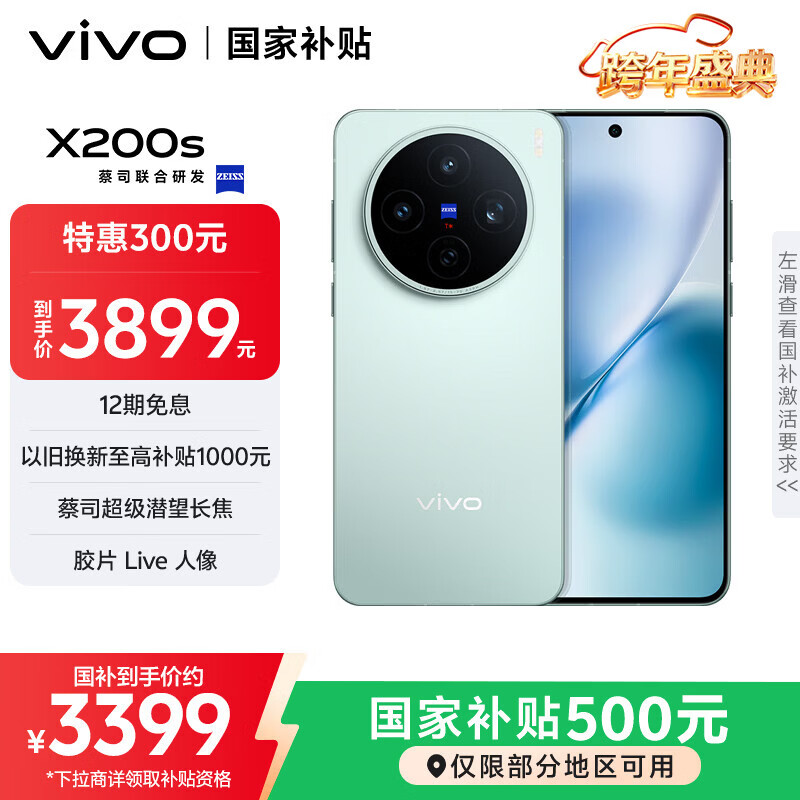 自营vivo 【价低抖音超值购】X200s 12GB+256GB 薄荷蓝 国家补贴 蔡司超级潜望长焦 湿手秒开超声波指纹 拍