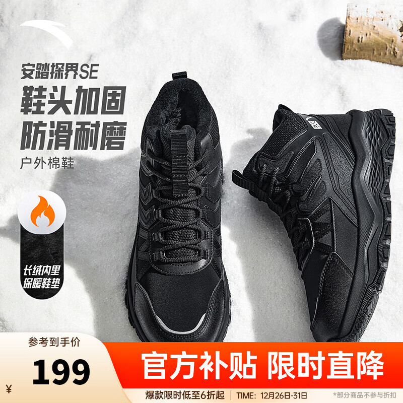 百亿补贴安踏探界SE丨户外加绒保暖高帮棉鞋男女2025冬季加厚情侣运动鞋雪地靴 【男款】基础黑-4 42 (男)/38(女)