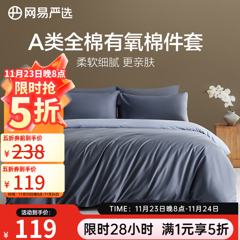 网易严选A类柔有氧全棉四件套卧室宿舍学生新疆棉新工艺柔软亲肤 【升级加厚】烟灰蓝 床单款 【被套】1.8m床:2.2*2.4m被芯