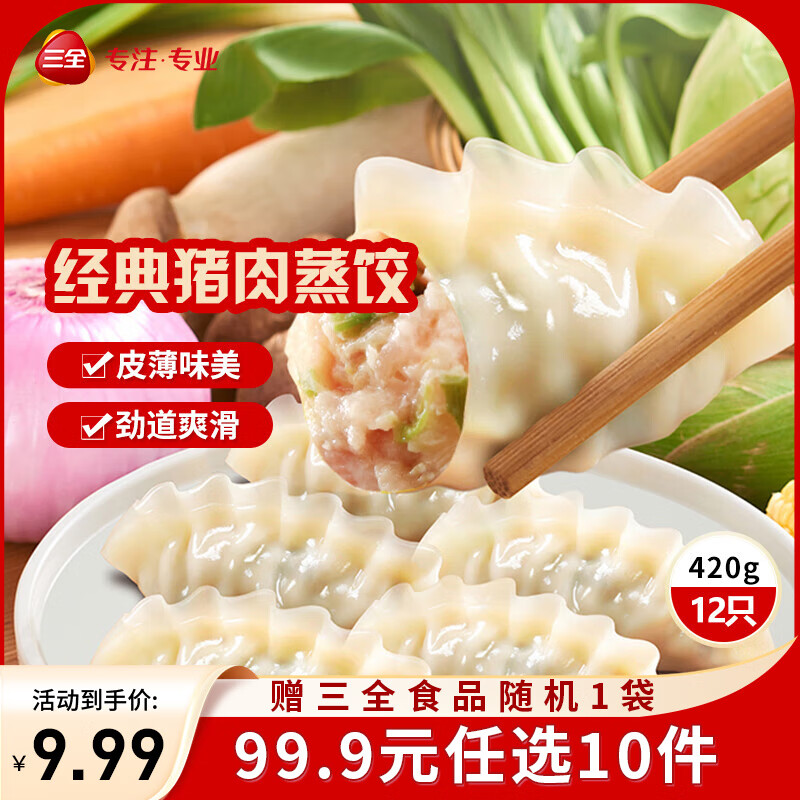 三全黄金比例水饺含馅量≥60%可煎炸蒸煮饺子方便家庭早餐半成品晚餐 猪肉饺子王420g12只
