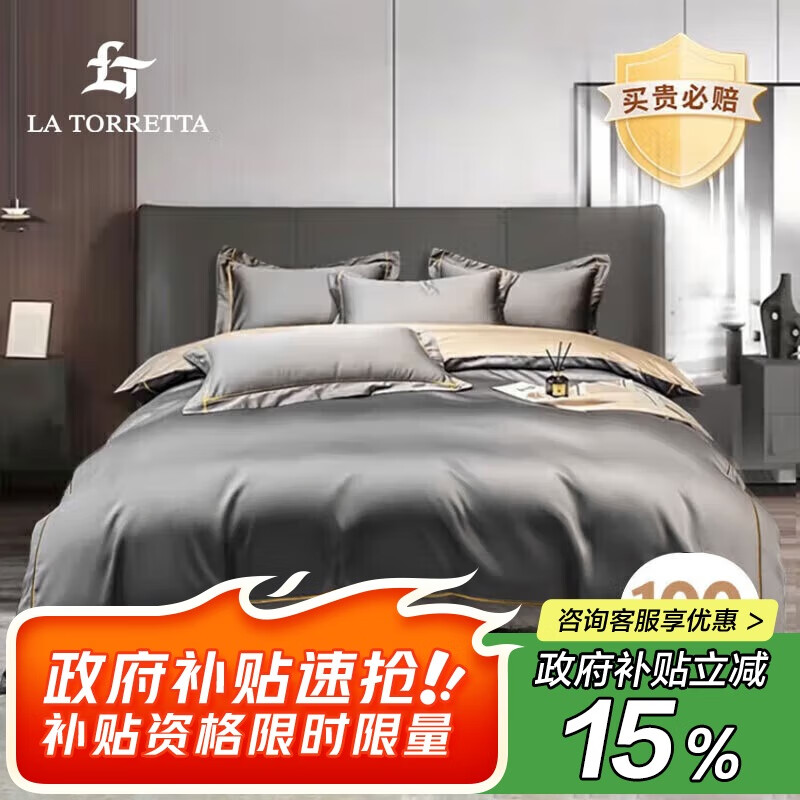 La Torretta100支长绒棉床上四件套100%纯棉 高档抗菌被套床单1.8/1.5米床 灰