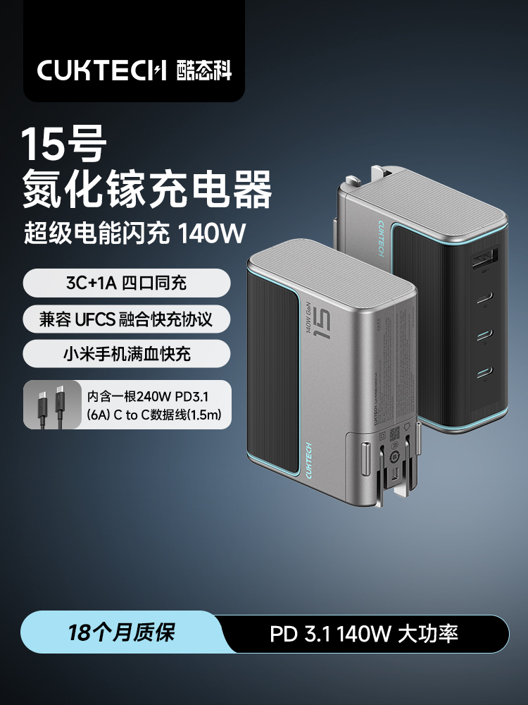CUKTECH酷态科15号GaN氮化镓140W快充Type-c100W适用苹果17ProMax小米笔记本充电器头百补秒杀