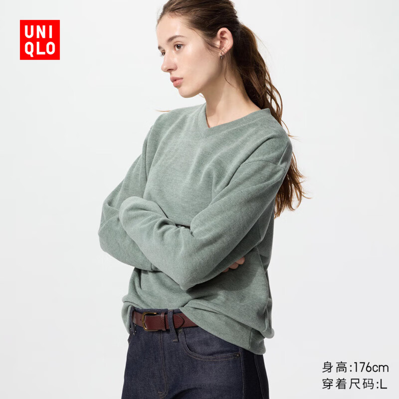 优衣库女装柔软针织摇粒绒V领套头衫/长袖25秋冬新款479756 52 翠绿色 M