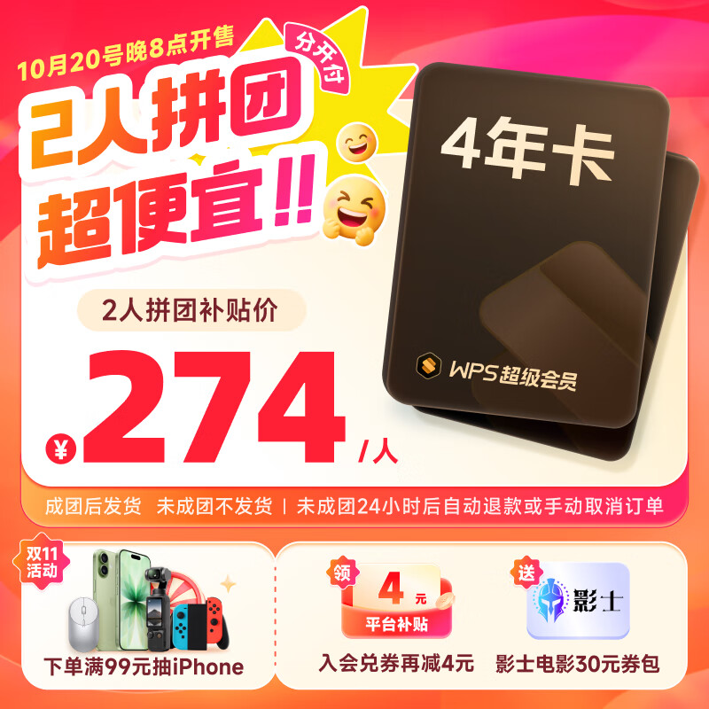 【2人拼团274元/人】WPS超级会员4年卡1488天 海量PPT简历总结思维导图模板资源 365G个人云空间文件存储支持手机电脑多端同步 发兑换码 WPS超级会员4年卡