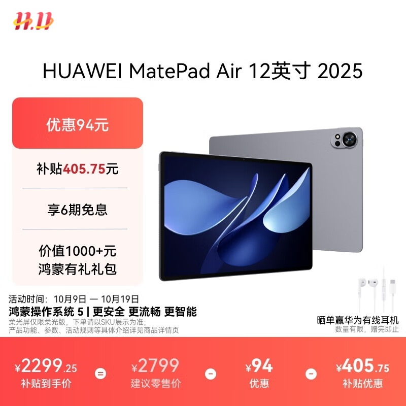 HUAWEI MatePad Air 12英寸 2025 华为平板电脑 鸿蒙AI 2.8K高刷超清全面屏 WIFI 8GB+256GB 羽砂白