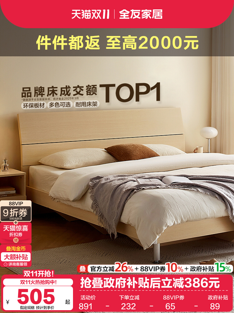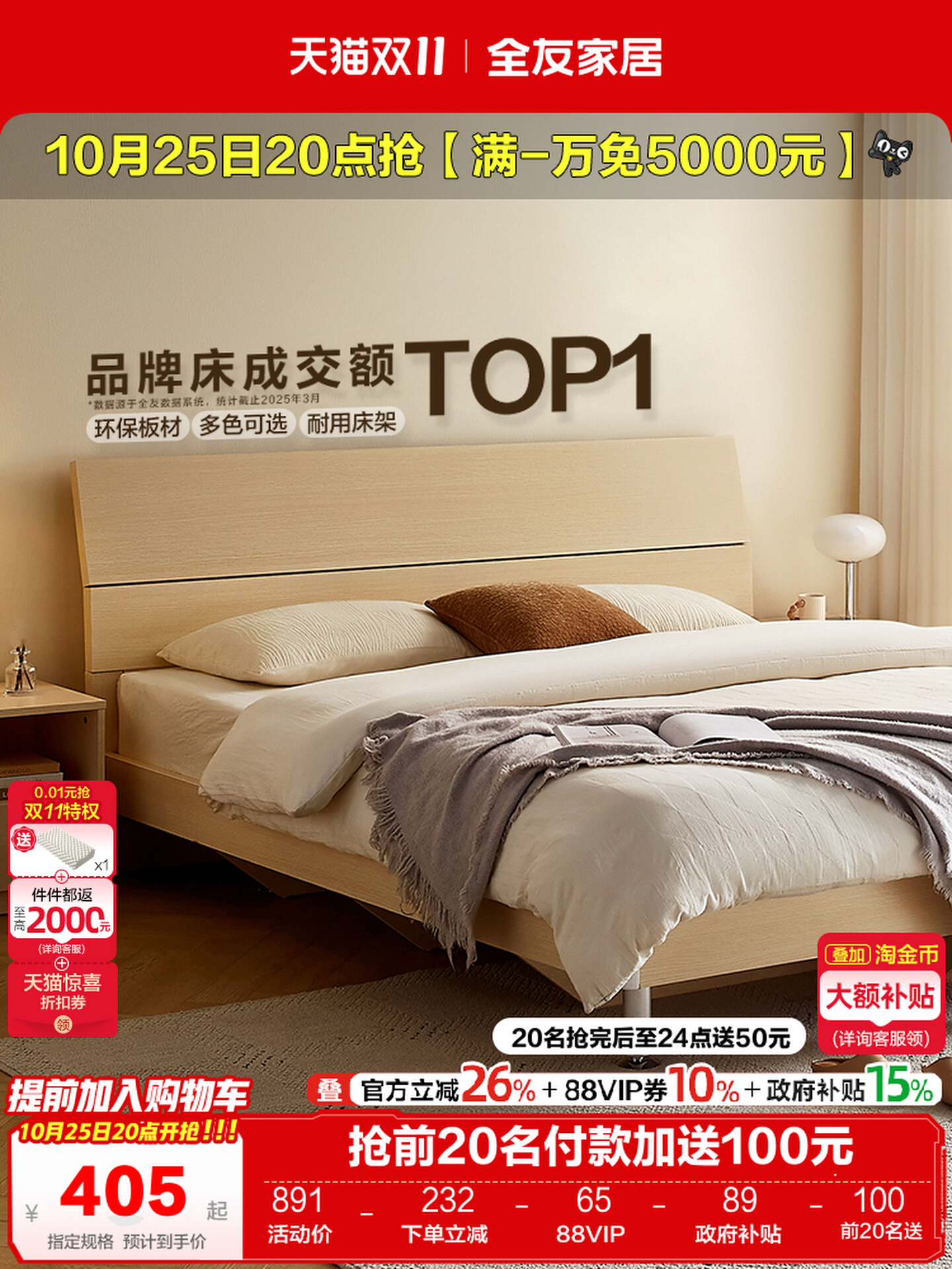 全友家居家用1.8m双人板式床架出租房屋用1米5卧室单人床2025新款