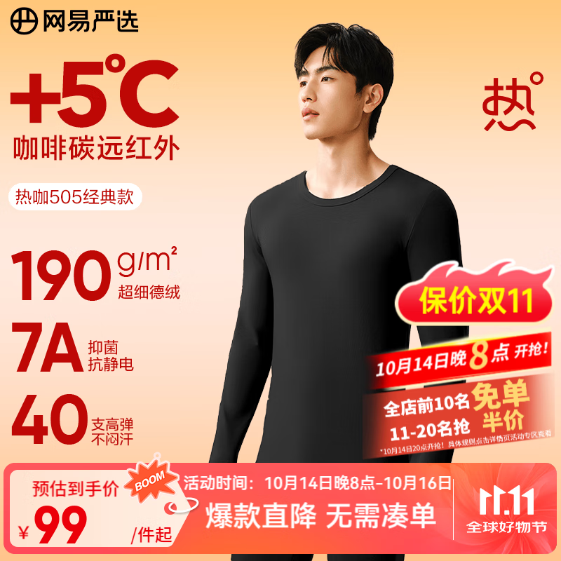 网易严选新品热咖505经典保暖内衣27%德绒咖啡碳7A抗菌升温190g高弹防静电 A款25升级-玄烟墨-男 L