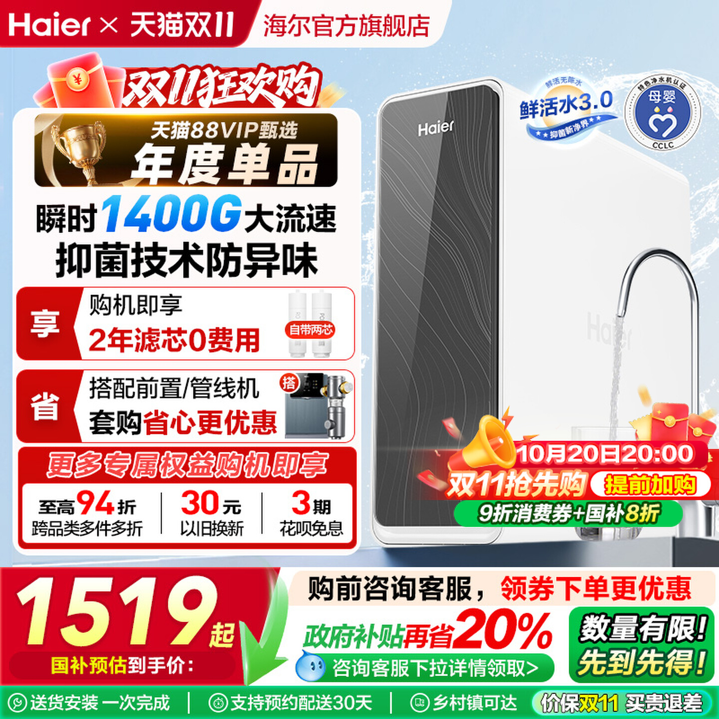 【政府补贴】海尔鲜活水PRO1200G净水器厨卫直饮家用净饮机R762