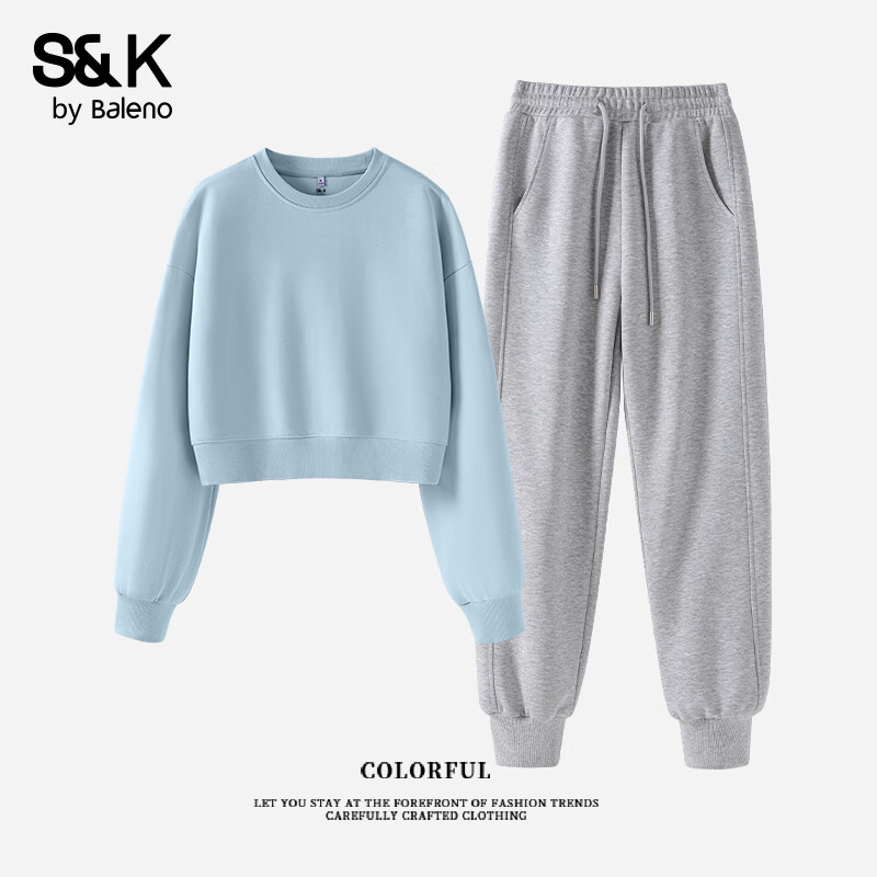 班尼路BALENOS&K系列运动套装秋冬新款休闲圆领卫衣搭配简约时尚收脚裤两件装 雾霾蓝#纯色+灰#纯色 M