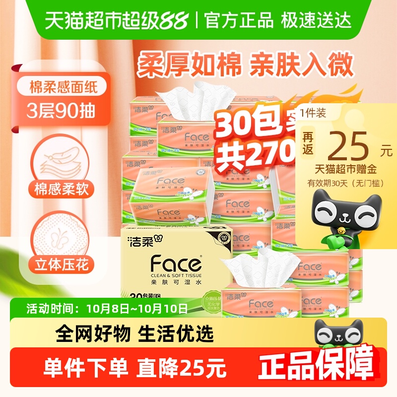 【下拉享优惠】洁柔抽纸棉柔感立体压花3层90抽30包软抽面巾纸