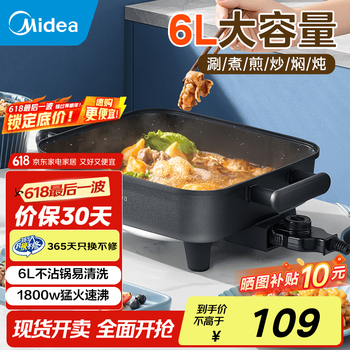美的(Midea)电火锅 电炒锅家用多功能电锅煎烤涮一体电热电煮锅6L 火锅锅不粘烤鱼锅 国家补贴 6L 【加深平底锅】DY3030Easy101