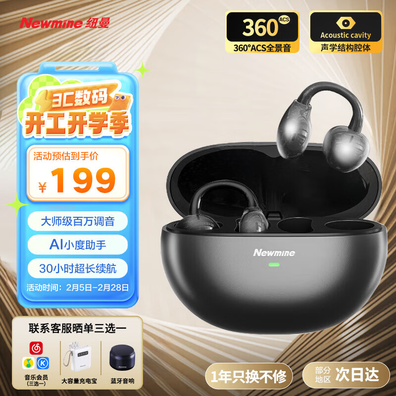 纽曼(Newmine)S6无线蓝牙耳机耳夹式 AI小度智能 挂耳翻译耳机骨传导概念HiFi级音质办公会议记录多语种实时翻译 重磅新品丨千元音质丨无尽黑