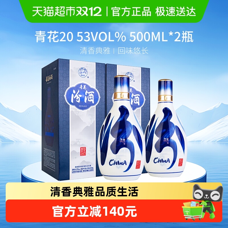 汾酒杏花村青花20清香型500ml*2瓶53度白酒商务宴请送礼(带礼袋)