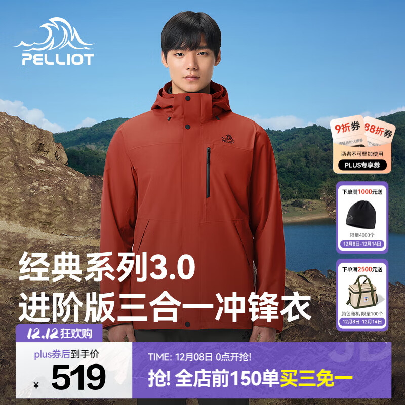 伯希和(Pelliot)【经典3.0山野】冲锋衣三合一男女新款秋冬防风防水登山保暖外套 【出片首选】丹霞红 | 配置升级 S