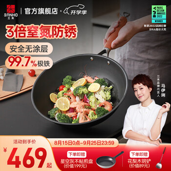 三禾 氮化炒锅窒氮轻铁锅炒菜锅无涂层高纯熟铁多用平底不易生锈锅具 99.7%熟铁-玻璃盖+铲子 32cm