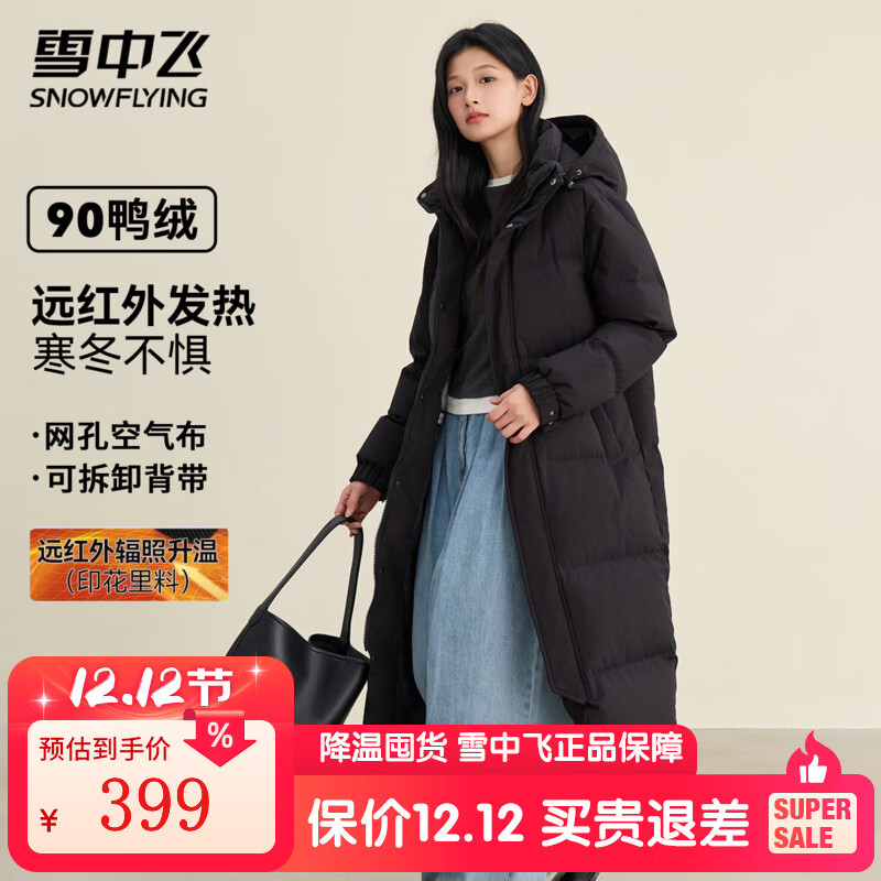 雪中飞羽绒服女士冬季高级简约纯色百搭红外发热蓄热保暖长款羽绒外套 黑色(男女同款) S (160)