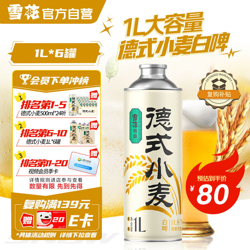 雪花啤酒(Snowbeer) 德式小麦精酿白啤11度1L*6罐 整箱装 热门商品