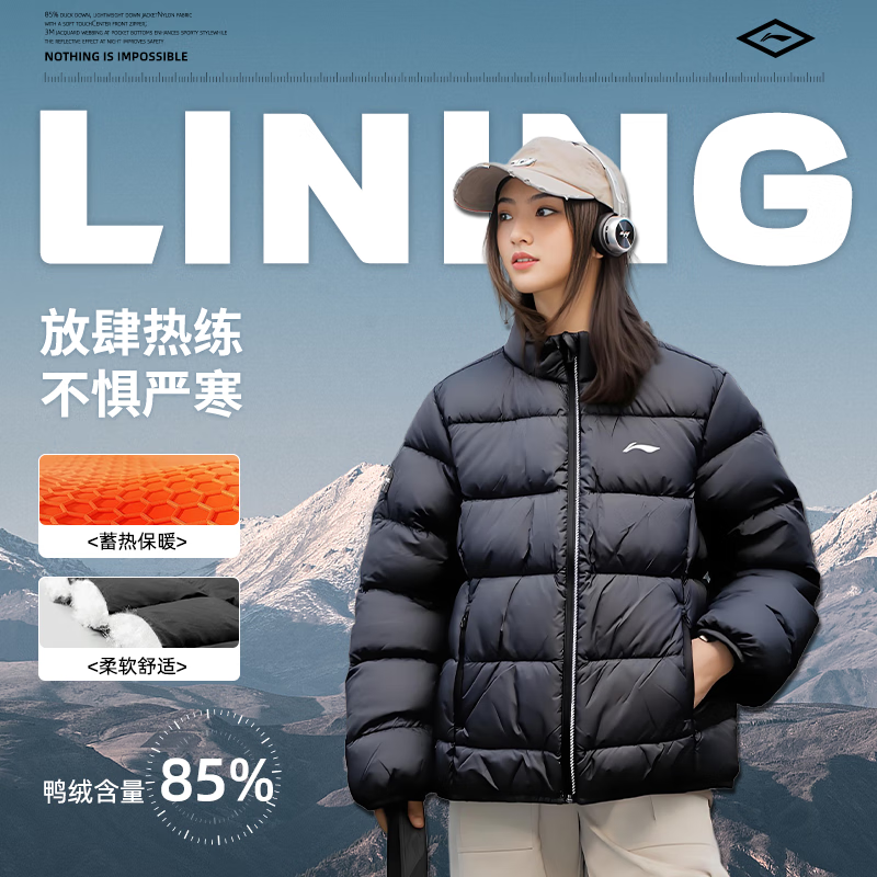 李宁(LI-NING)25秋冬新款羽绒服防风保暖长款立领连帽大赛服羽毛球羽绒外套 【短款】85绒-黑色 L (175)
