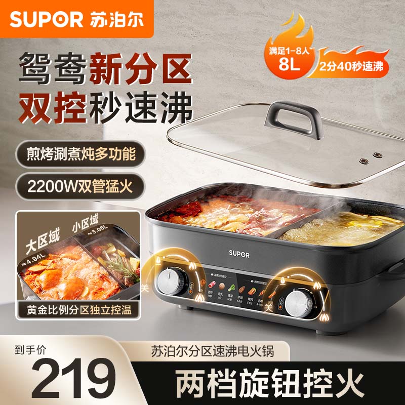 苏泊尔(SUPOR)电火锅鸳鸯锅8L大容量家用聚会火锅专用锅涮煮锅多功能锅分区控温2200W猛火速沸5-8-10人 8L 鸳鸯一体锅