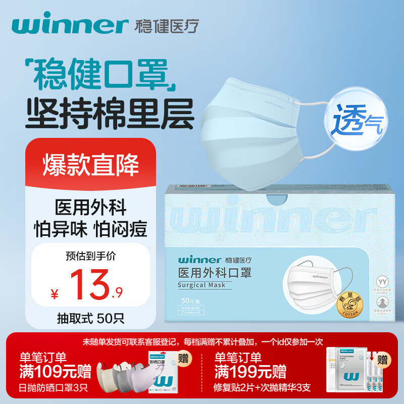 稳健一次性医用外科口罩50只/盒 棉里层亲肤透气防尘防花粉过敏性鼻炎