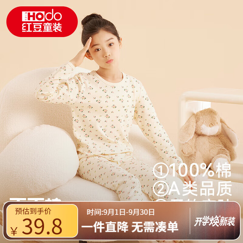 红豆儿童纯棉秋衣秋裤套装男女中大童薄款秋冬保暖内衣A类全棉棉毛衫 H4M1028白色 150